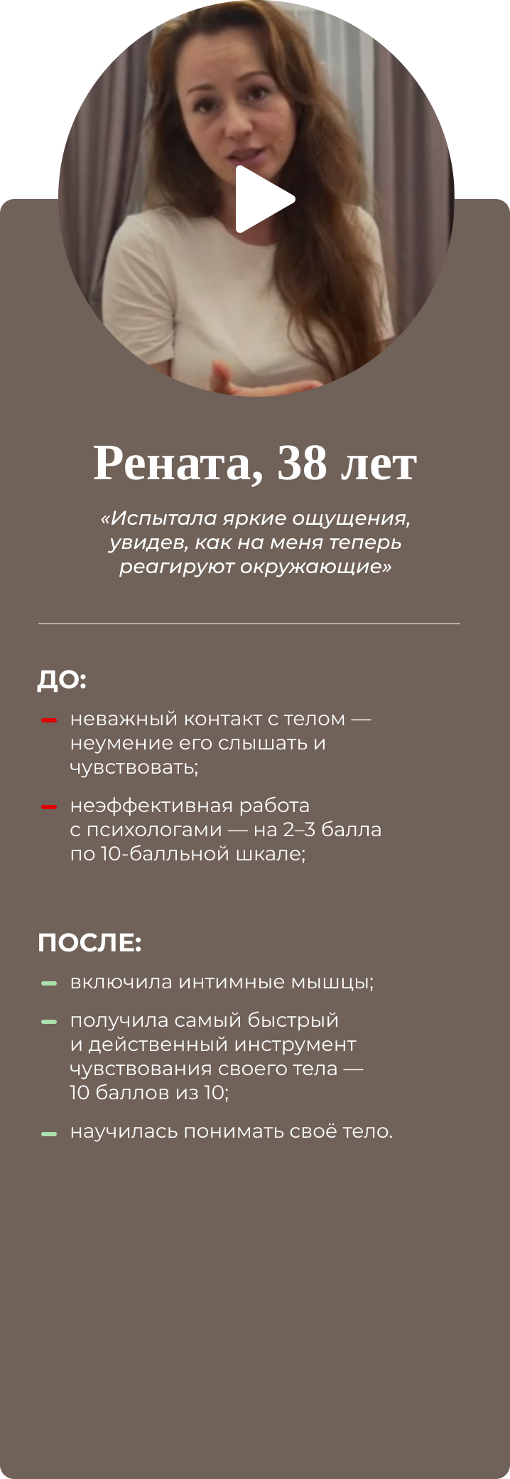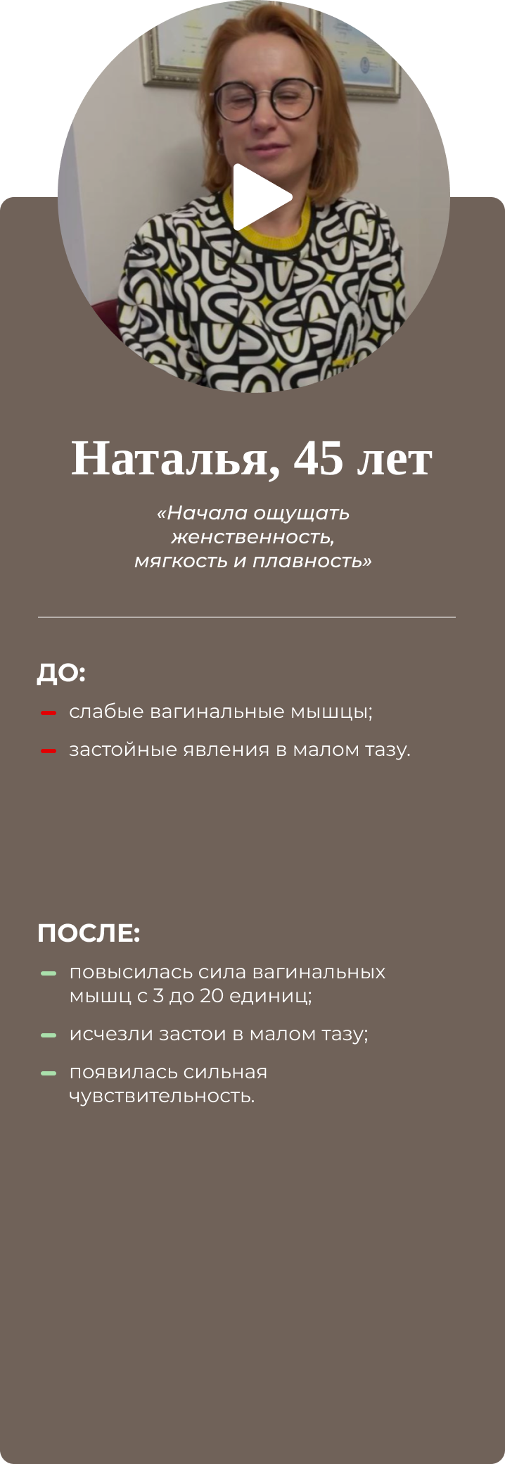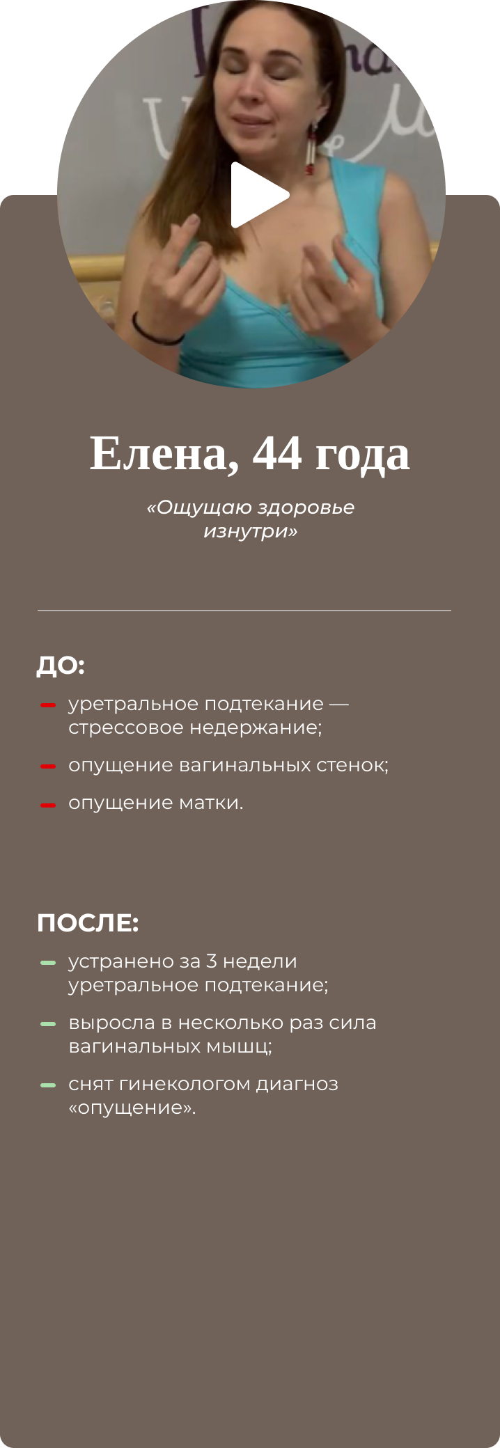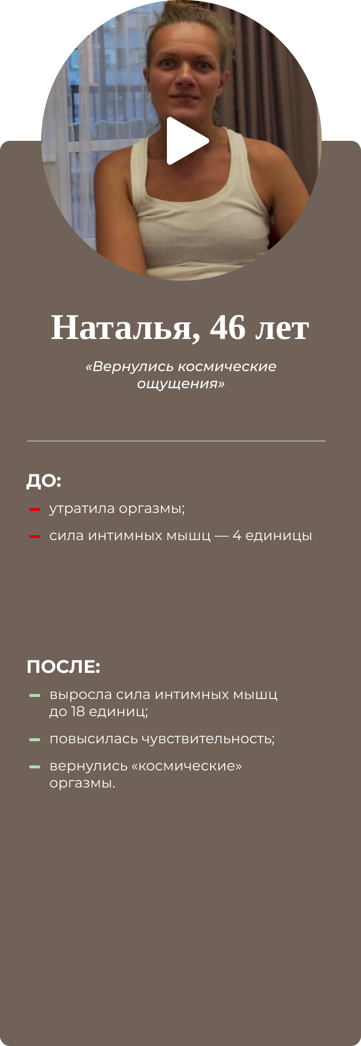 Четырёхдневный интенсив для женщин. Восстанавливает интимное здоровье, возвращает умение управлять гормонами и яркую сексуальную жизнь. Результат разработки упражнений на основе создания проприорецепторных связей: мозг-интимные мышцы-мозг. Совместно с гинекологами, урологами, кинезиологами. Имеет 100% эффект, подтверждён практикой.