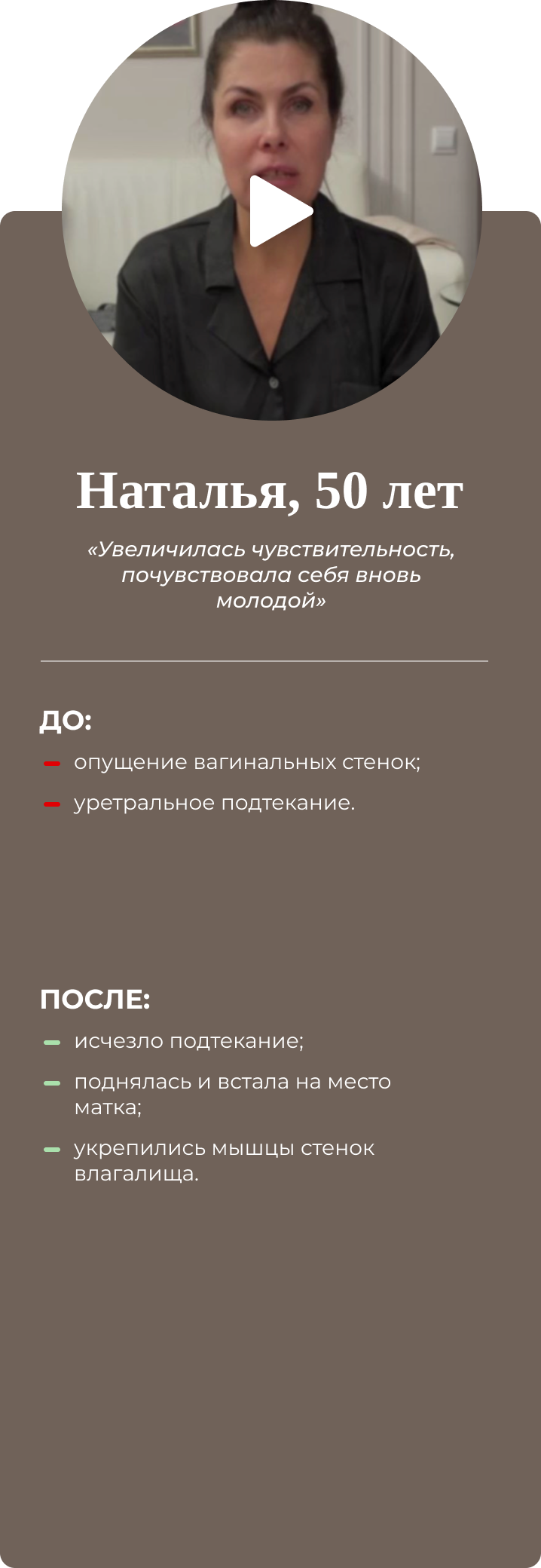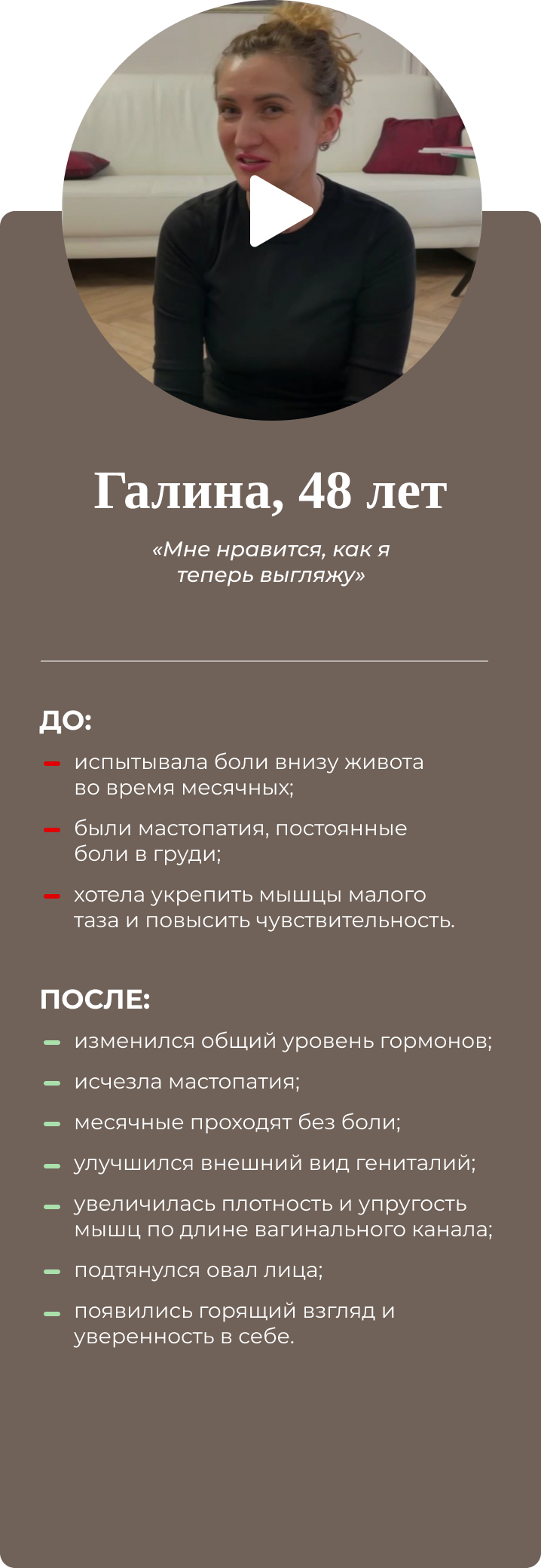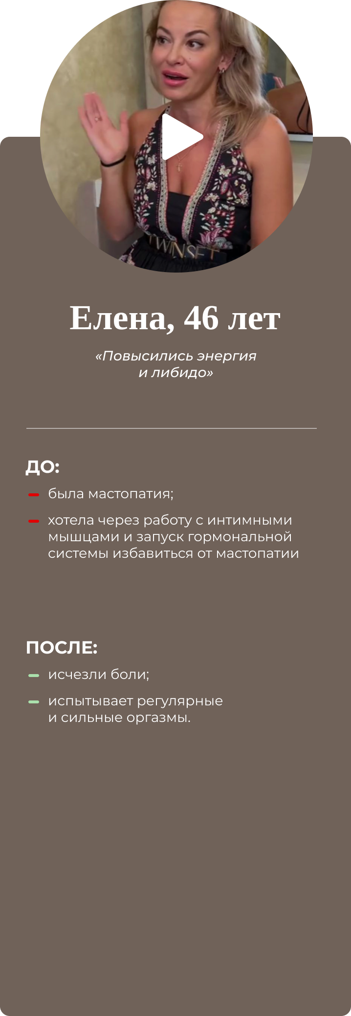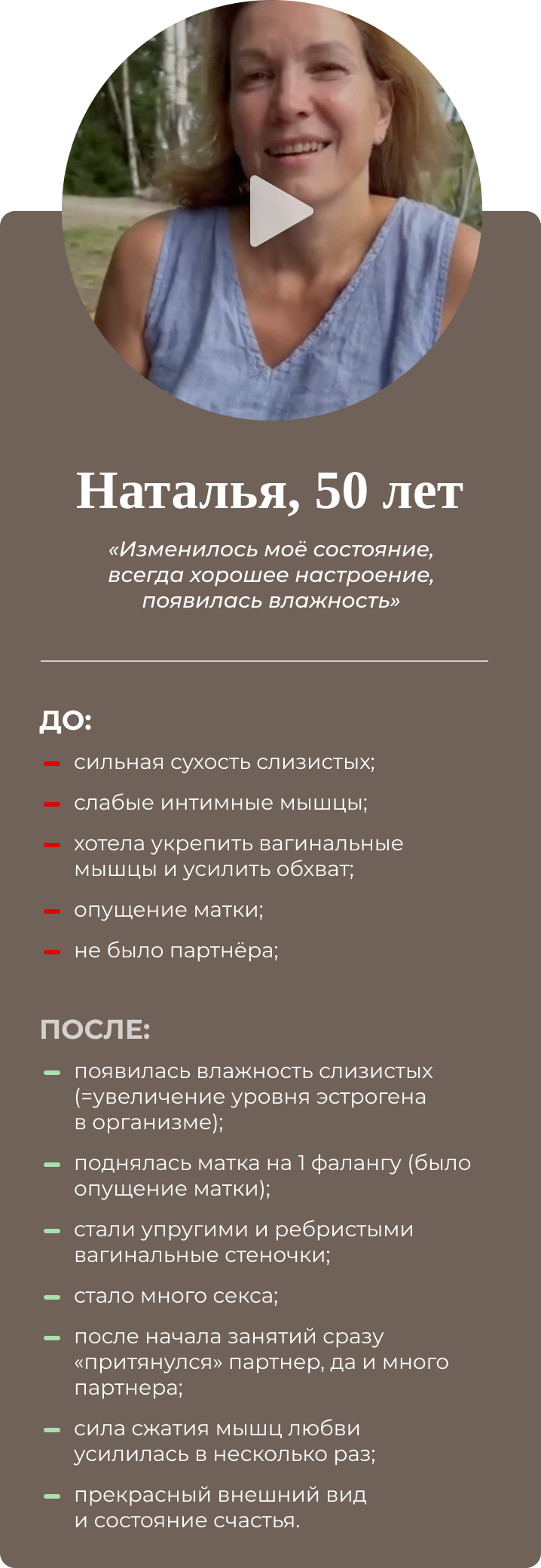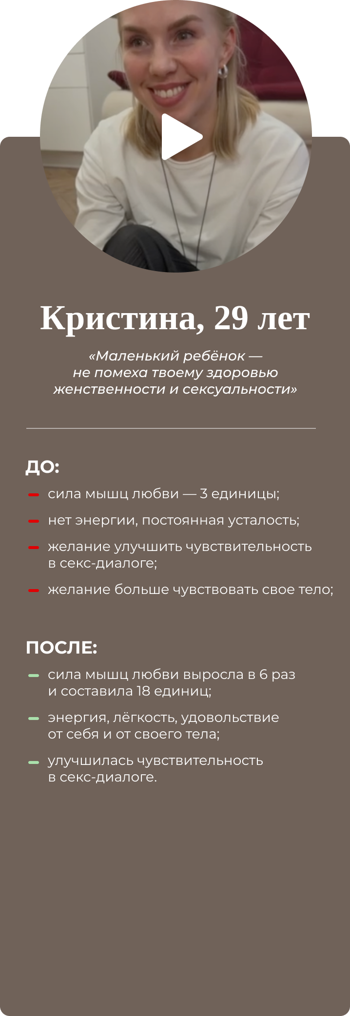 Четырёхдневный интенсив для женщин. Восстанавливает интимное здоровье, возвращает умение управлять гормонами и яркую сексуальную жизнь. Результат разработки упражнений на основе создания проприорецепторных связей: мозг-интимные мышцы-мозг. Совместно с гинекологами, урологами, кинезиологами. Имеет 100% эффект, подтверждён практикой.