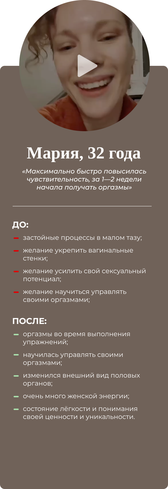 Мастер-класс в записи. Самый короткий путь в женский оргазм независимо от возраста, состояния партнёрства, опыта. Квинтэссенция знаний и техник, которыми должна владеть каждая женщина, желающая иметь яркие, чувственные, запоминающиеся эмоции в сексуальном партнёрском взаимодействии. Мастер-класс для женщин, которые: